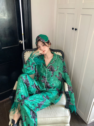 Style: “Crouching Tiger Hidden Dragon" series use traditional official green and peach blossom pink as the basic color, which is bright but not florid. The pajama is made of jacquard satin fabric that is soft, comfortable and full of Chinese characteristic. Tailored collar and detachable ostrich feather is modern.